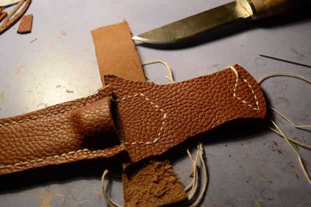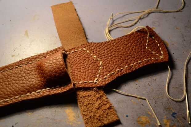 Pegar la pieza a la vaina, había perforado los agujeros y comenzó a coser todo junto. No coser a la parte media por lo que sería posible fijar la funda al cinturón.