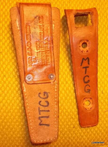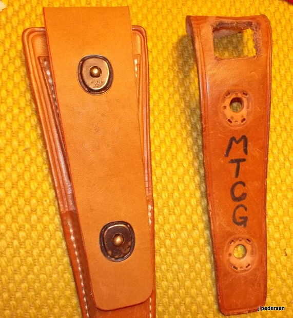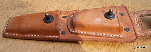 Encontré esta interesante funda de cuchillo doble en un mercadillo y se pagó sólo $3. Decidí cambiar la aleta por el agujero y las iniciales de marcador negro en él.