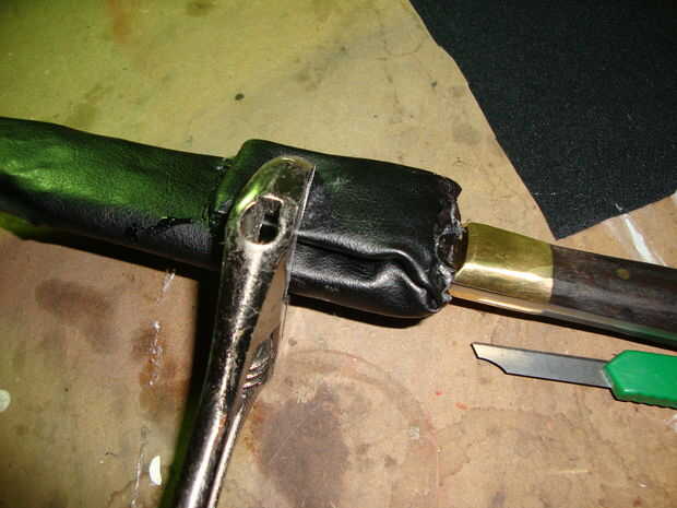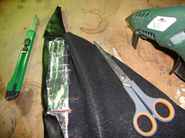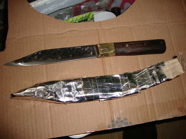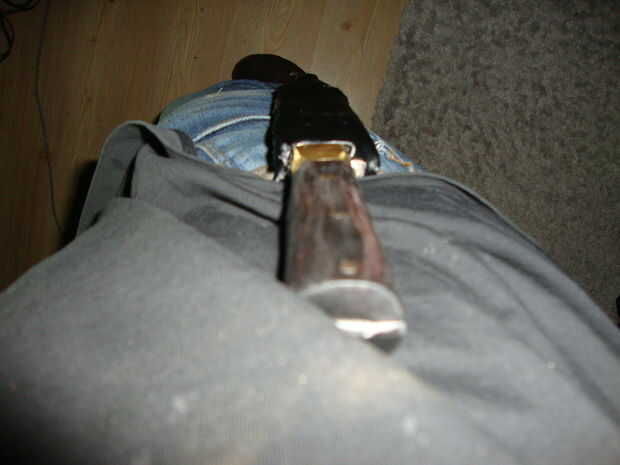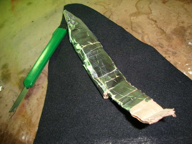 Dibujar el cuchillo en la cartulina y doble como se ve en la imagen. Recórtalo, doblez y cinta alrededor de ella. Cubra con «todo lo que parece el cuero» y utilizar el pegamento. Dobla la parte de cinta y pegamento a sí mismo. Cuando es seca, ponga encendido y admirar su trabajo. Que ganado, campeón! Je je. Bueno, lo sentimos,