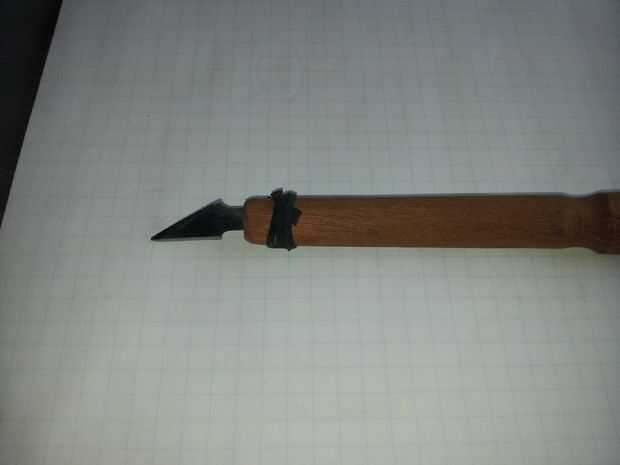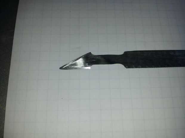 Herramientas necesarias: amoladora de banco / piedra archivos húmedo/mojado lija materiales Sierra de marquetería: rotos o usados Sierra para metales sierras de hoja toda hoja espiga de 3/4 goma/secuencia la línea trazado el perfil de su elección en la hoja, hice mi diseño con un lápiz led, puede ser más técnico y añadir un trozo de cinta adhesiva y el perímetro de la línea de la rutina. Iniciar a su áspero afilado en la derecha de la amoladora de Banco después de que usted haya terminado con su perfil. Tiempo para empezar a afilar con la piedra mojada, mina es un dos caras 80 / 300 arena. Si lo desea, puede utilizar papel de lija. Termino de pulir los lados para reducir la fricción. Cortar su stock de 3/4 a la longitud deseada y cortar una ranura con la Sierra de marquetería en un extremo para recibir la espiga de la hoja. Envuelva el extremo cortado con una banda elástica, utilicé un trozo de un tubo interno viejo. Todo tomó unos 20 minutos hacerlo y los resultados son fantásticos, va a hacer un par más con diferentes perfiles.