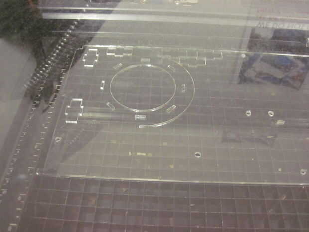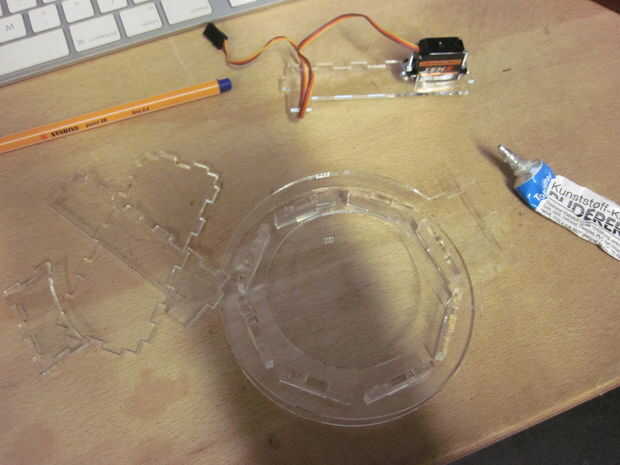 OK eso fue straigt adelante: recortar los diseños con el cortador del laser del laboratorio. No hay problema. Las piezas son montadas con pegamento plástico. Solo Monte el servo antes de ensamblar, de lo contrario será mucho más difícil (que era ya tarde en la noche, por lo tanto, la yo elegido la otra manera).