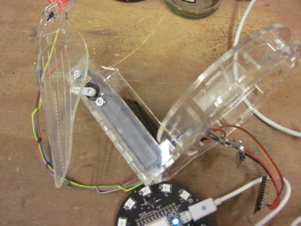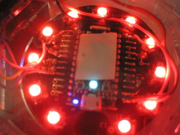 OK, no hay realmente buenas fotos aquí, pero fue bastante fácil: dos filas de pinheaders (usé unos doblados, pero los rectos no deberían ser un problema) se insertan los conectores e n la hembra se conecta en el tablero del botón de chispa (bien diseñado, por cierto, la única desventaja de esta junta es que faltan 12 led - sólo mi opinión). Los dos cables de un 3 * AAA batería detrás están el soldado a VIN y a Gnd, el servo también a esta dos pernos A0 como línea de control, los leds se sueldan juntos a la tierra en el otro lado de la Junta de la bujía y luego - con una resistencia de 150 Ohm en el conector - superior ojo (paralelo de dos leds) a D6 , Ojo menor a D5 (otra vez dos leds de paralelo), la parte frontal led (pecho) a D0 y el regreso llevó (ala) a D7. O alguna otra manera, sólo hay que cambiar los pernos en el programa correspondiente.