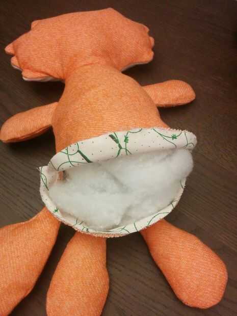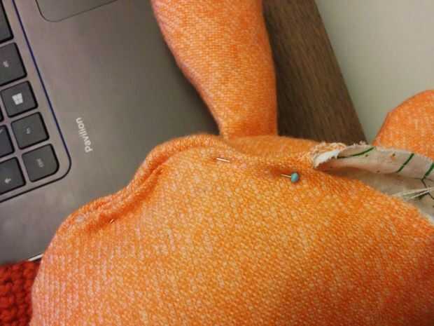 Casi listo! Ahora tienes que rellenar el resto del zorro, tenga cuidado de utilizar suficiente relleno. Entonces puede sembrar la parte inferior para la parte posterior del cuerpo. Tomar ambos lados y doblar hacia el interior. PIN que juntos y use una puntada invisible para acabar la parte inferior. Usted puede mirar donde hay otra brecha que necesita una puntada y después de que su fox lindo está listo.