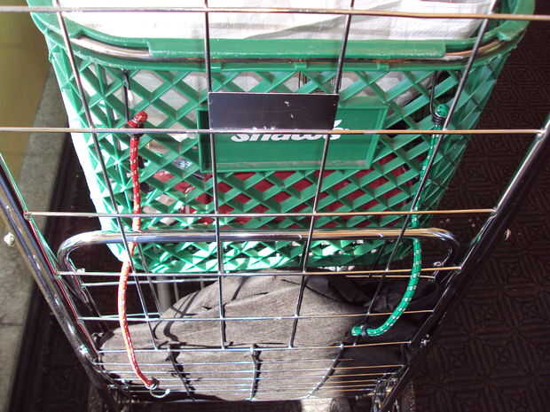 Cuarto: entonces, apoyada en su carro para que frente del carro es cerca de usted, y su carro está en el medio, pase una cuerda de bungi desde su base en la parte delantera de la cesta de la tienda, a través de su carro doblado. Tire de la cuerda de bungi a través de su carro para que el cable está justo debajo de la barra superior en la parte trasera del carro (no el mango) y en la segunda barra en la parte frontal de su carro. Como tienes el cable, debe tener él va de la mano, a través de su carro y colgar en el carrito de la tienda. (A menos que quieras mantener tu carro en el aire, le resultará necesario haber empujado tanto carros hacia atrás contra la pared, con la cadera.) Luego, con su carro suspendido, traer el bungi hasta su carro, alrededor de su lado y tenso, enganche lo bien por el lado de la cesta de la tienda, hacia la parte delantera del carro tienda como el cable de bungi le permitirá ir.