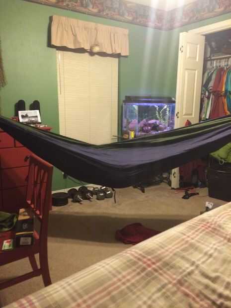 me encanta hamacas! Son una gran manera de permanecer fuera de la tierra húmeda fría. Aún mejor son cómodos! Yo uso una hamaca cada vez sigo camping. Quería una manera para colgar una hamaca en el interior. Esto es lo que se me ocurrió. ¡ Disfrute!Ma