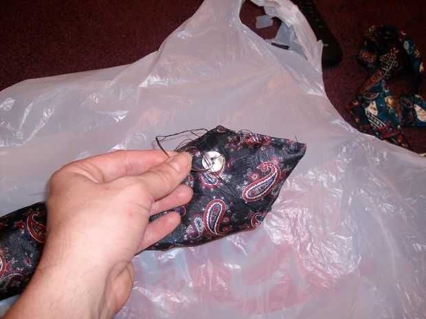 Modding 2 corbatas convencionales en una reversible retro-ascot.Es necesario:-Dos corbatas convencionales de ancho suficiente y casi el mismo ancho.-Máquina de coser, destripador de la costura, plancha, tijeras de tela, juego de hilos, alfileres, agu