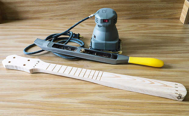 Con una escofina y una lijadora pequeña, arena el cuello todo para suavizar los bordes ásperos y para crear una forma ligeramente redondeada en la parte posterior del cuello. Limpie cualquier polvo de madera de la lija. Ahora es un buen momento para teñir o pintar el cuello si se prefiere.