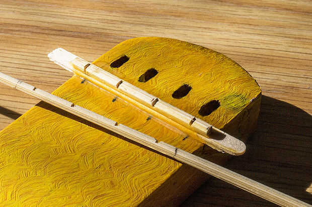 Hacer una tuerca y puente primera raspa un lado de un pincho de 1/8" de diámetro hasta plana con el lado de la hoja de utilidad. El lado plano proporcionará mayor contacto al pegar las dos piezas para el cuello. Vi las muescas para la cuerda en el lado redondeado una con un cuchillo de navaja Xacto X75300 Sierra y utilidad. Espacio la cadena soportes como se muestra en el diagrama de abajo. El espacio de la cadena debe ser igual, y las cuerdas exteriores no deben ser muy próxima a los bordes del cuello. Hacer muescas en el pincho de bambú puede ser tedioso y puede tomar más de una tentativa. Estas piezas pueden ser modificadas una vez en su lugar y bien construido o talladas profundas para afinar la jugabilidad. Pegar la tuerca al cuello y revuelve de centro de madera bajo el pincho puente para construir hasta la altura apropiada. Pega la revuelve y puente en un subconjunto y luego péguelo en el cuello. Si lo prefiere, utilice un trozo de plástico duro a estas piezas de moda. Una regla establecida de la tuerca al puente en la ranura de la cadena debe borrar el primer traste por aproximadamente 1/32" y el traste XII por aproximadamente 1/8".