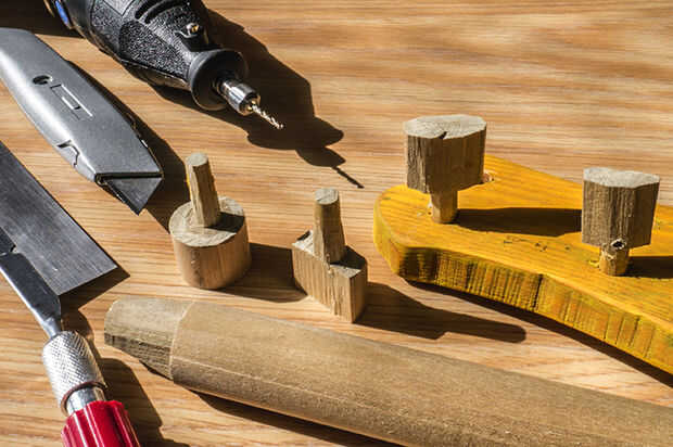La foto muestra las etapas de tallar las clavijas de afinación de izquierda a derecha.