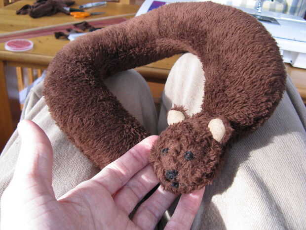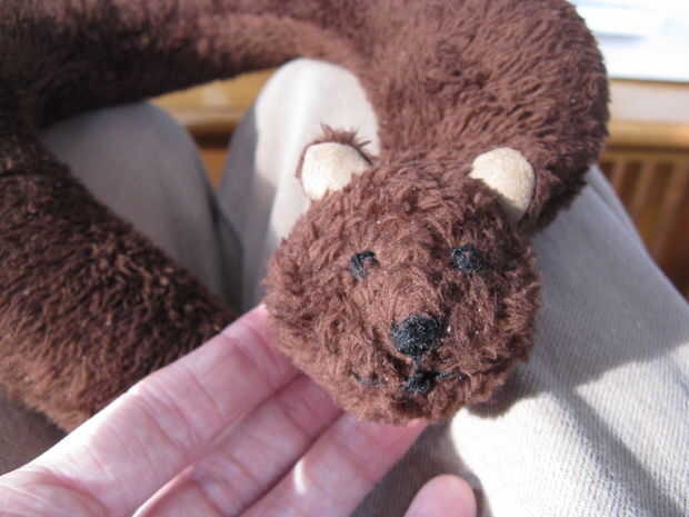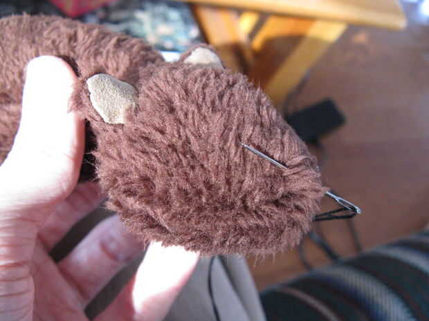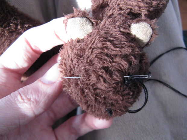 Cuando esté satisfecho con la nariz, tomar algunas puntadas pequeñas para formar la línea que va desde la nariz a la boca y la boca sí mismo. Luego moverse a donde desee ojo para ser y repetir el proceso en un círculo pequeño. Lo mismo para el otro ojo. Para terminar, hacia la parte inferior de la nariz y nudo y esconder el hilo allí. Esto parece ser el mejor lugar para hacer sus nudos, como se combinan en la nariz.