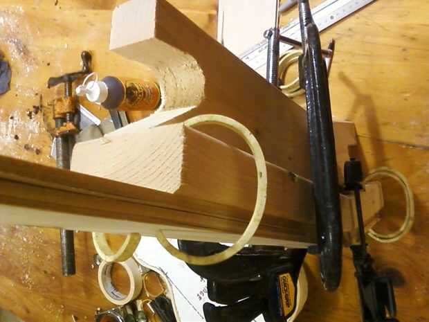 Trabajar su camino hasta las capas de esta manera, terminando con dos láms sin fibra de vidrio entre ellos. Presione hacia abajo en la transición de la cabeza y el cuello, mueve el lams para asegurarse de que encajen. Abrazadera de bloques sobre el cuello y la cabeza. Quiere exprimir lo suficiente que una gota del pegamento aparece a lo largo de las costuras, pero no tan duro que exprimir el pegamento de las juntas.