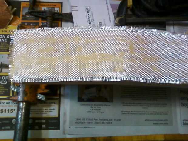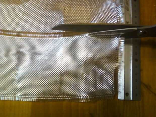 Preparar previamente la tela de fibra de vidrio. Se necesita 4 piezas 4 x 19". Tela de fibra de vidrio se puede encontrar en ferreterías. Lo limpios que he encontrado para cortar es sacar de 4 a 6 hilos del tejido, luego cortar por la mitad de esta pista. Esto asegura el corte es cuadrado y mantiene los hilos largos intactos y en su lugar.