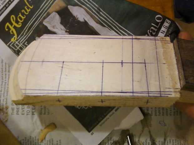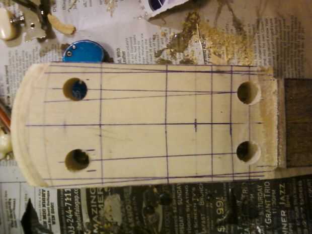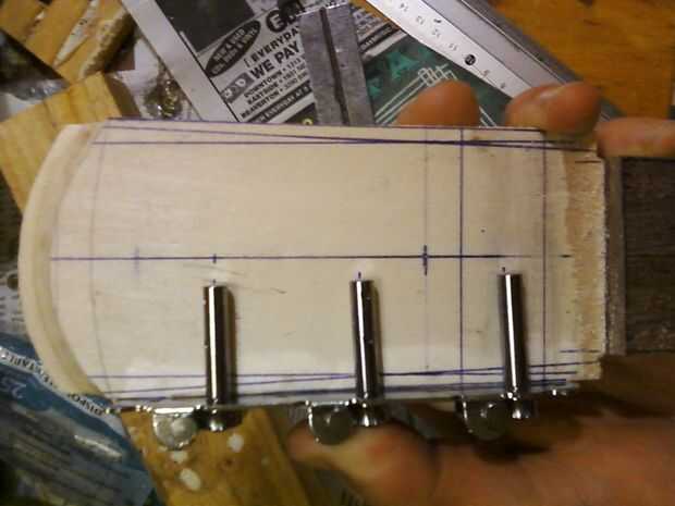 Me gusta una cabeza ligeramente acampanada. Cortar los lados y coloque una máquina sintonizador contra él. Marque los centros de la sintonización de barriles, y luego dibujar una cuadrado con los lados de la línea del borde al centro. Hacia la plaza al otro lado de la cabeza, trazar una línea cuadrada desde el cruce del centro al borde.