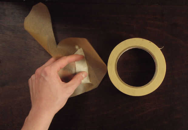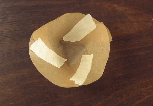 Plegar el pergamino para que el borde de una aleta se alinee con la línea de puntos. La cinta esta costura en su lugar (usted debe grabar en el interior del recipiente). Únalos con cinta adhesiva las otras dos uniones de la misma manera y voltear el tazón de fuente.