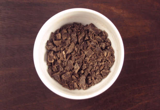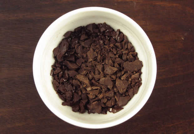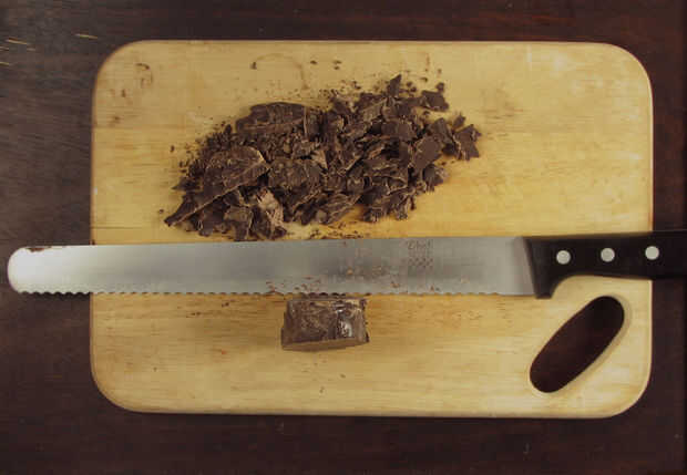 Su Temple irá más rápido y sin problemas si te pique muy finamente el chocolate. De hecho, este método depende de ello. Un cuchillo de sierra hace el trabajo rápido de chocolate. Picar el chocolate muy finamente para que no trozos son más grandes que una lenteja.
