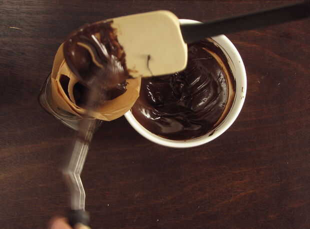 Coloque una punta del cornet abajo en su tarro. Utilice sus espátulas para cuidadosamente scoop y raspar el chocolate derretido en su cucurucho--tratan de evitar que cualquier chocolate en la parte superior 2" de la corneta. (Creo si vierte directamente de la taza es muy fácil de hacer un lío). Llenar el cono de un tercio a una mitad llena de chocolate derretido. No llene demasiado, puede parecer como se van a ahorrar tiempo, pero realmente sólo harás un lío. Levante el cono y sujetar con costura al frente. Apriete suavemente el chocolate hacia abajo hacia la base de la corneta. Tratar de que todos los chocolates de la parte superior dos pulgadas de la corneta. Doble los extremos de la corneta lejos de usted. Entonces empezar rodando el final de la corneta lejos de ti, como si fuera un tubo dentífrico. Cuando son tuberías con la corneta, seguir utilizando este movimiento de balanceo para exprimir el chocolate hacia fuera.