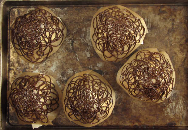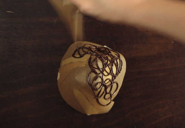 Cortar la punta de la corneta. Apriete un poco chocolate hacia fuera para asegurarse de que está fluyendo bien y bonito, incluso líneas. Si las líneas son onduladas, corte un agujero ligeramente más grande desde el final de su cucurucho. Exprima el chocolate en un patrón loopy, superpuesto hasta que han cubierto la superficie de la forma de tazón de fuente. Asegúrese de que utilizar gran cantidad de superposición de líneas, a pesar de que el patrón debe ser delicado si es demasiado delicado, el tazón de fuente se rompe muy fácilmente. Continuar tubería todo el chocolate hasta que se han cubierto todas sus formas de tazón de fuente. Si te quedas sin chocolate antes de que termines, simplemente genio otro lote de chocolate y recoger donde lo dejó. No importa si el chocolate de un tazón de fuente se canaliza hacia fuera de dos lotes diferentes.