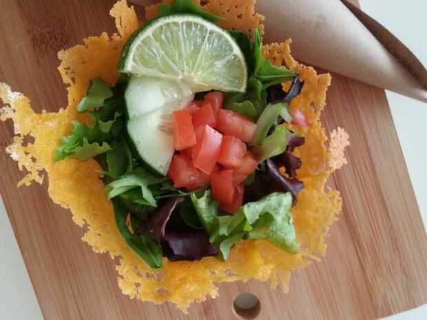 estaba comiendo un queso a la parrilla el otro día y consiguió algunos de esa textura crujiente a la parrilla en el exterior y el pensamiento, sólo quiero más de eso y sólo eso. Había cocinado por un poco de queso y me lo hizo en tazones de fuente para el juego. Son cuencos de crujiente de queso super sencillo hacer cualquier ensalada solo que enmascara. Ideal para la ensalada de taco o simplemente dip de salsa. Es como lazy nachos. Chip y queso en uno.