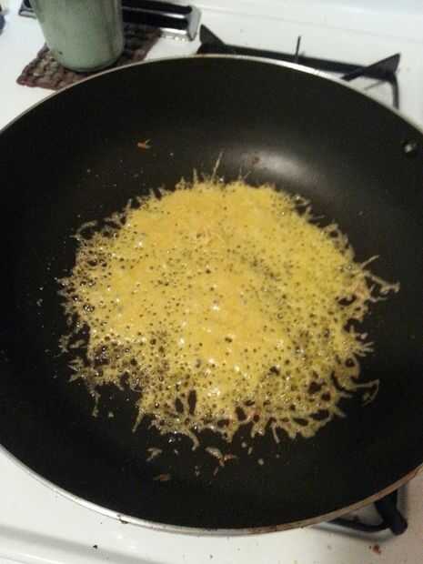 Usando un wok de fondo plano o a una sartén, poner en un puñado de queso a fuego medio. Después de unos minutos, comenzará a burbujear hacia fuera uniformemente. En este punto suelen verter apagado cualquier exceso de aceite que se libera, pero eso es opcional. Cuando los bordes comienzan a buscar apenas doradas, use una espátula para levantar alrededor de los bordes primeros y luego en el centro. Desea que el queso todavía flojo, pero si se atasca su espátula, darle unos segundos más.
