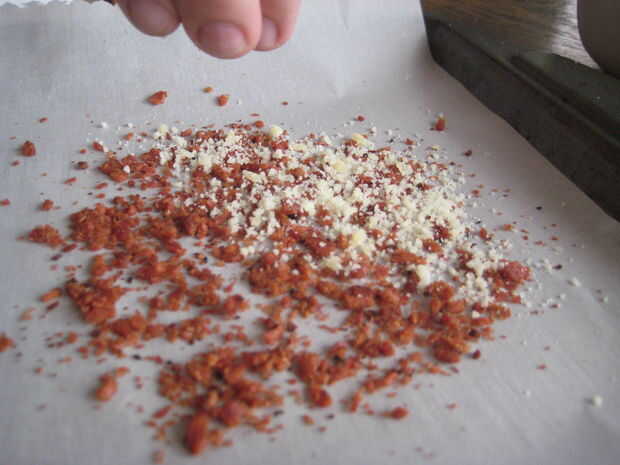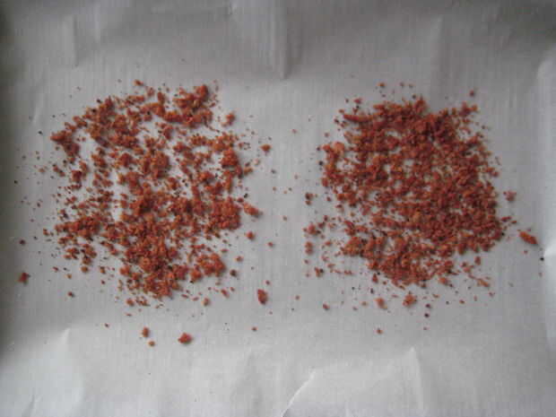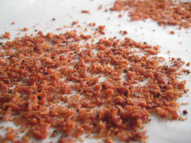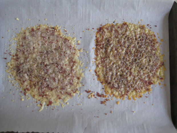 3. Espolvoree el tocino en 2 círculos grandes en la bandeja para hornear. Debe ser un muy fino, pero consistente