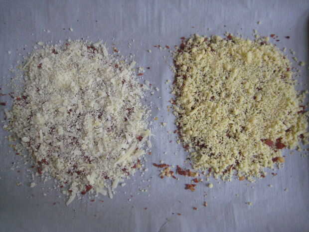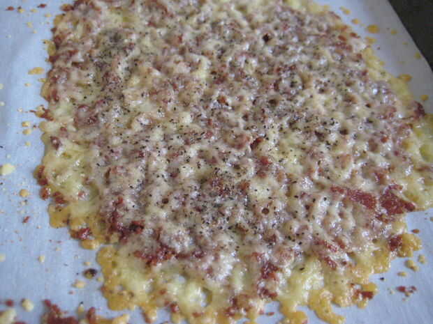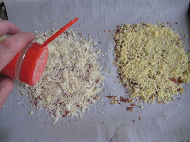 4. Rocíe una capa semi fina de queso sobre el tocino. Tocino o pergamino papel visible será un