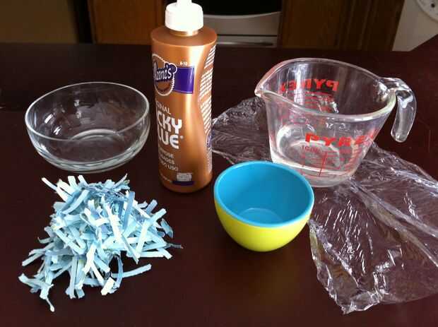 Necesitarás papel triturado, pegamento de secado transparente, película de plástico y un elemento (como otro plato) para utilizar como molde. Usted también tendrá acceso al agua. Si no te gusta usar las manos, entonces usted querrá un pincel de espuma para el pegamento, que también se puede utilizar para pintar la taza del acabado (opcional).