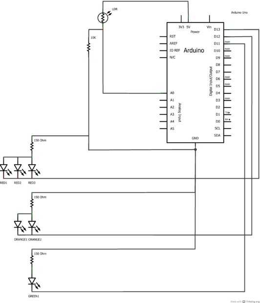 Todos los LED se conectan en paralelo con sus terminales positivo conectado a arduino (rojo - pin digital 13, pin digital naranja - pin digital verde y 12 - 11) y sus terminales negativo conectado a tierra a través de una resistencia de 150 ohm.