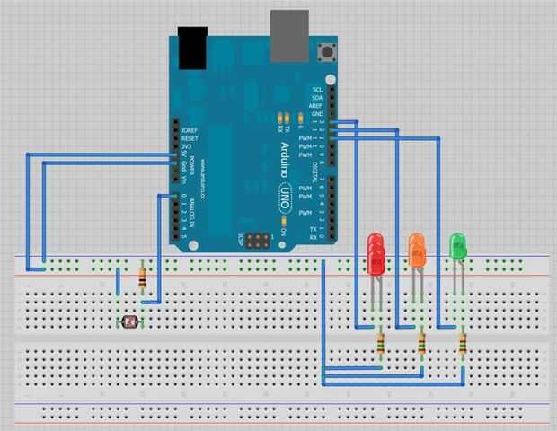 El ldr tiene una pierna conectada a 5 voltios de arduino y el otro conectado a tierra de la arduino a través de la resistencia de 10 k. La ldr también tendrá una pierna conectada a 0 analógico.