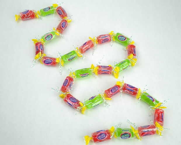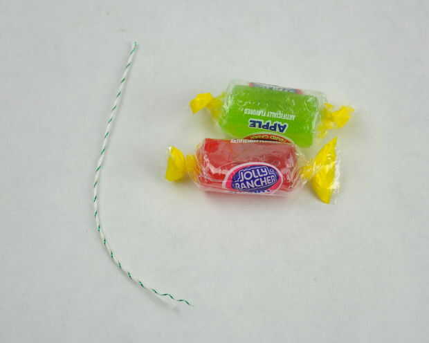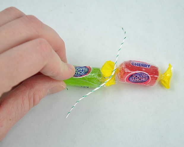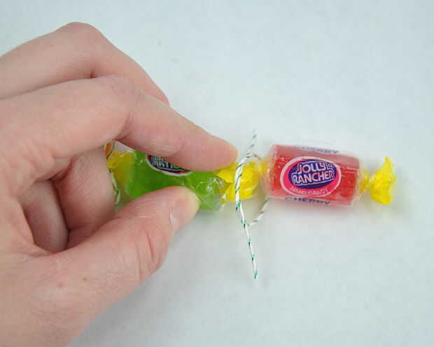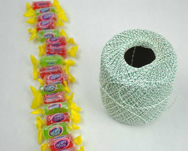 Tratar de que los atados donde la envoltura se encuentra con el caramelo (Foto 5). Se trata de la conexión más fuerte. Seguir a atarlos todos juntos hasta tener a todos conectados.