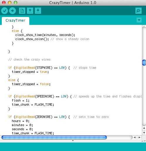 Cuando el temporizador llega a cero, la acción ahora es encender el LED que está ya conectado a D13 (usted puede verlo enciende para arriba en el video Cuando desconecto el cable rojo). Puesto que el pin proporciona 5 voltios, puede también utilizar para hacer otras acciones, como activar o desactivar un relé o gadget incluso correr un poco el sonido de una vieja tarjeta de felicitación, por ejemplo. También se podría modificar el código para hacer cosas más interesantes - por ejemplo, podría conectar un altavoz o zumbador y utilizar la biblioteca Arduino echadas a hacer un ruido (ver ejemplo de Tone_Melody Digital integrado de Arduino).