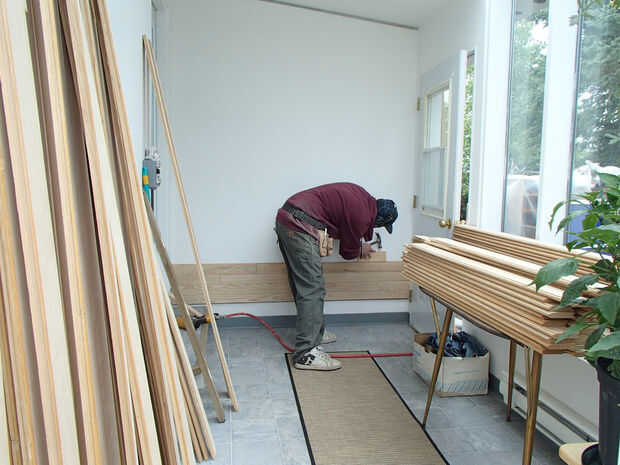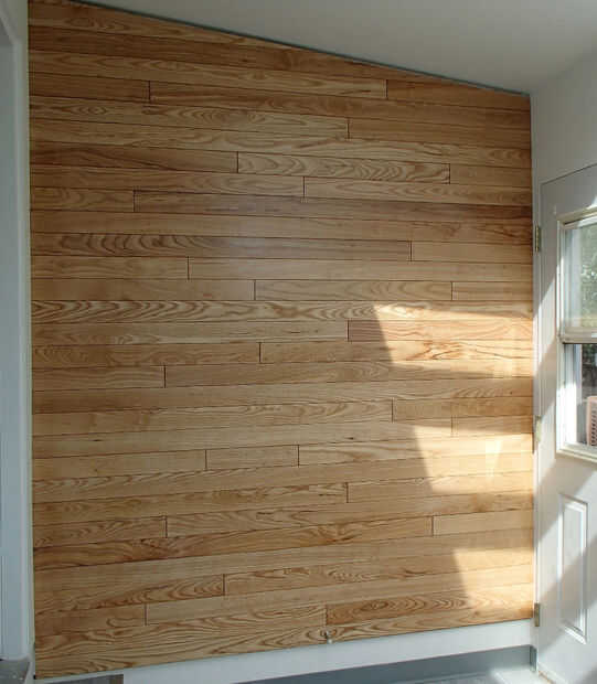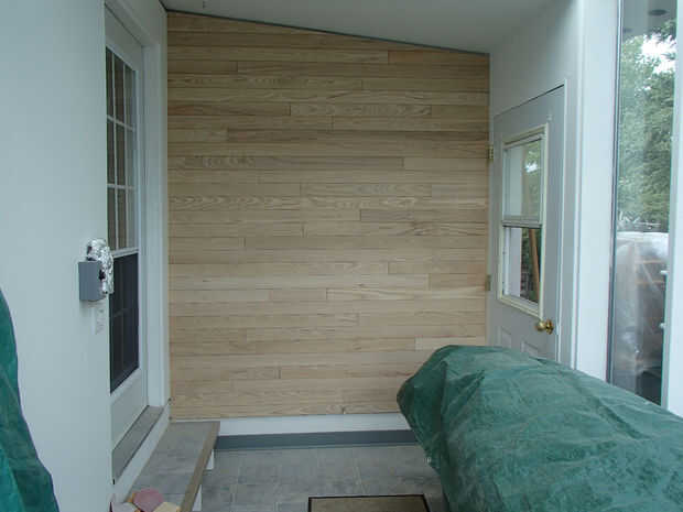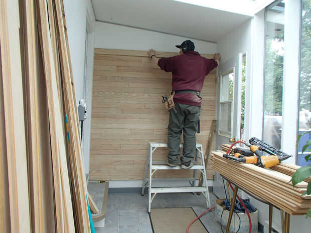 Si el techo es inclinado, usted tendrá algunos retos cortando los tablones con una sierra de mesa, pero con cuidado se puede hacer con buenos resultados (ver última foto). Es agradable tener una buena clavadora neumática.