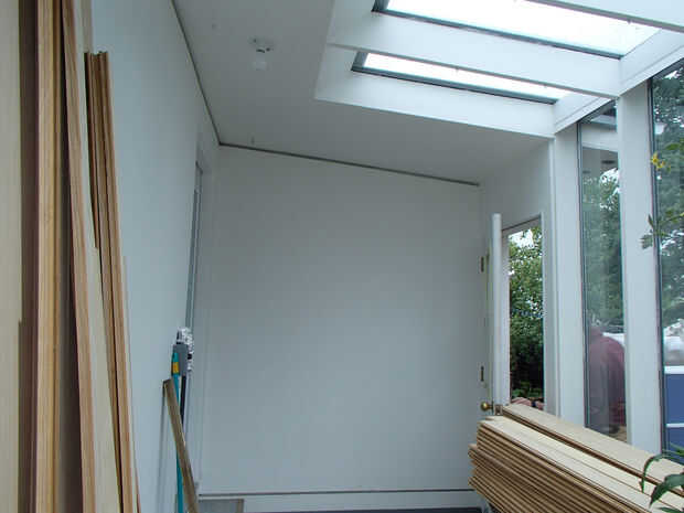 Cada pieza tiene recortado y luego cortar a la longitud con una tronzadora buena (y el borde de corte lijado), para asegurar un ajuste agradable, constante y firmemente. Usando el material recuperado fue un poco exigentes porque no todas las lengüetas y ranuras del mismo grosor y forma...