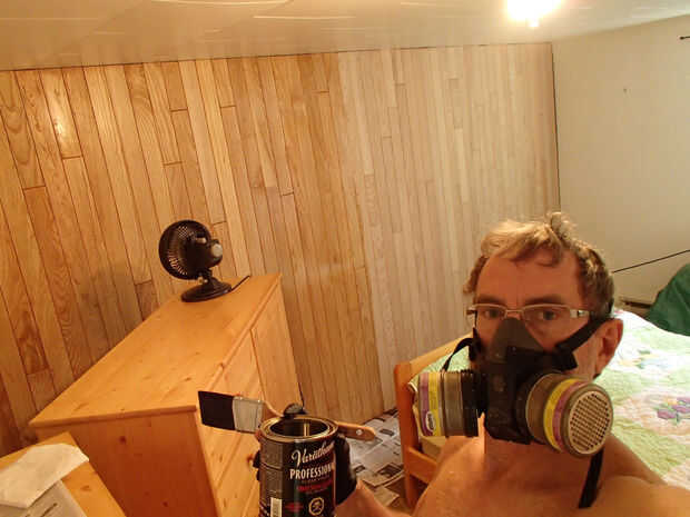En este caso que puse en solo 3 manos de barniz porque no habría ninguna exposición UV - no olvide usar un respirador apropiado al usar pintura a base de aceite en el interior.