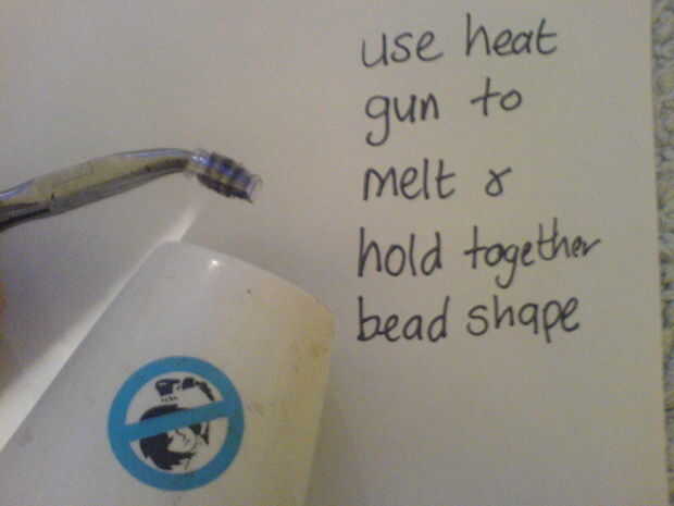tuve que aguantar la tira de plástico rooled en mis alicates, que estaba muy caliente! La forma del grano comenzó a formarse una vez que el plástico estaba caliente! Las tintas también funcionaron en uno a. Permití que mis granos se enfríe.