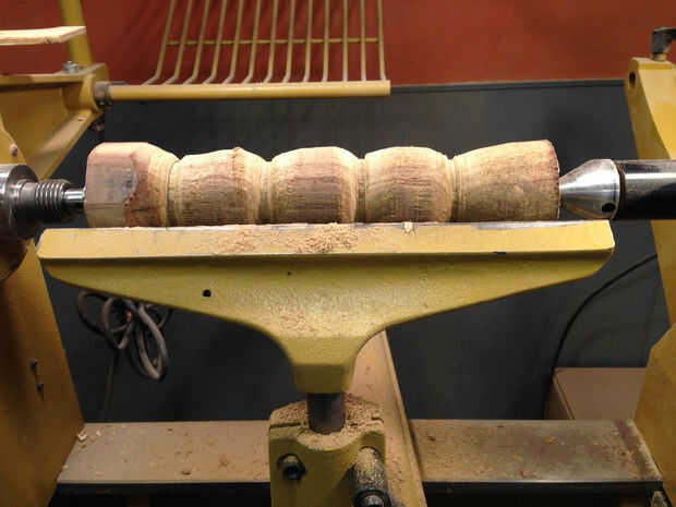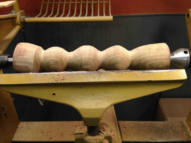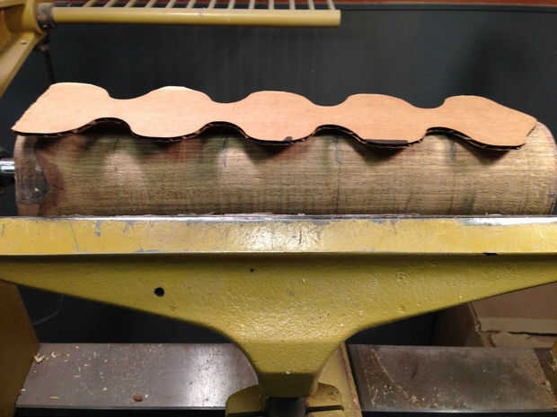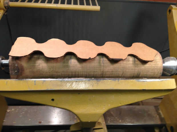 una vez que la configuración de mi madera en el torno y girando a baja velocidad, utilicé la guía de cartón añadir varias marcas de lápiz que indica donde las curvas de caída y subida. Me pareció más rápido para conseguir el rascador pequeño delgado y despedida cinceles para hacer la profundidad final de cada inmersión (es decir, donde las marcas del lápiz son). Así, es más fácil de tallar las pistas hasta punto final. Asegúrese de que usted siempre talla hacia abajo y nunca hacia arriba, por así decirlo.