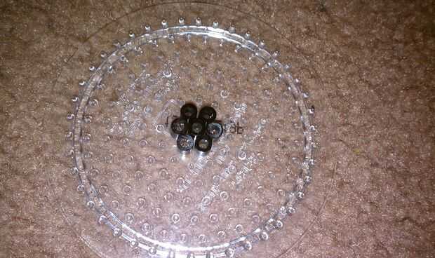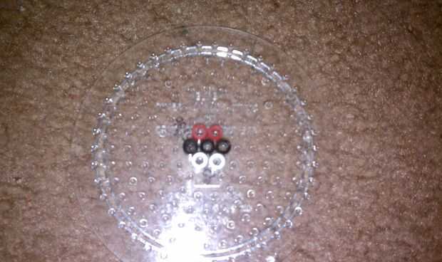 Hola, estoy echando unos bailes curva ahora! Esta vez, empezar a 6 filas de y hacer un círculo de granos sólo negros y otro con una línea negra en el centro y 2 gotas de rojo y blanco en ambos lados de la línea. Hierro y ponga a un lado.