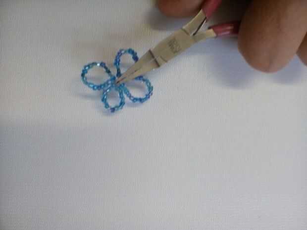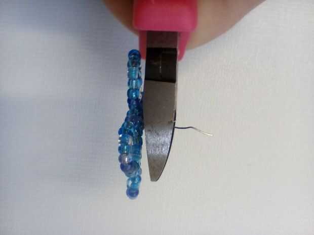 Ahora tenemos que eliminar el exceso de alambre en los extremos. Usando las pinzas, hazte con ambas de las colas de alambre y tuerza juntos firmemente. Luego use los cortadores para cortar las colas de alambre como cerca de los granos como usted puede.