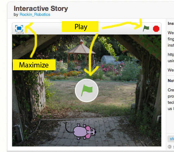 Una vez que estás registrado en Scratch, clic aquí: http://scratch.mit.edu/projects/45011790/ para ver la plantilla de historia introducción básica hemos creado para usted. Usted puede elegir jugar la historia maximiza la pantalla y pulsando el icono de la bandera verde. Una vez finalizada la introducción puede comenzar a colocar los títeres de dedo en la mano uno a la vez que se introduce en los distintos personajes.