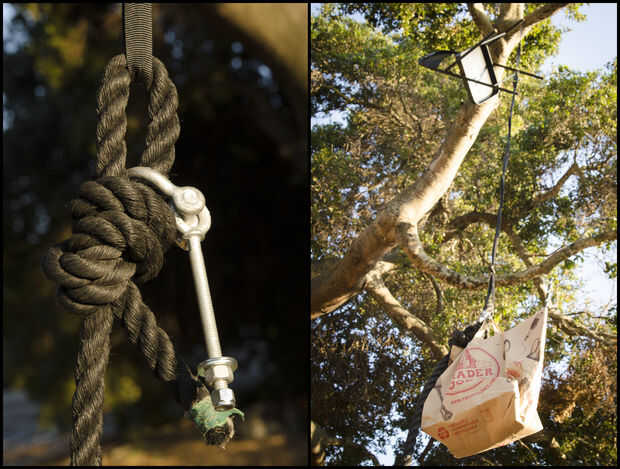 Si trabaja solo (como yo), ponen en una bolsa que puede izar herramientas en el árbol.