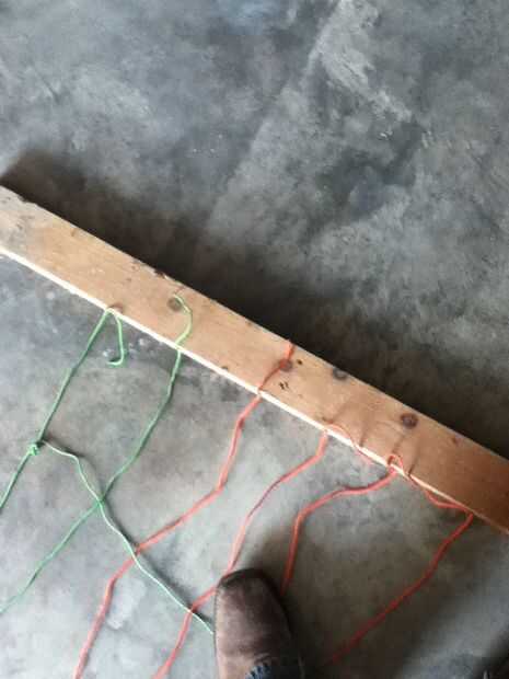 Ok así que primero hacer las matemáticas para calcular hasta qué punto aparte sus cuerdas tienen que ser y marcarlos en la cara su 2 x 4 que quiera tomar un punzón para marcar los agujeros donde se taladra los agujeros. Bien empezar por trazar su tablero y su cuerda, cortar a la longitud deseada y engrape la cuerda a la parte superior de la Junta donde se correlacionan los agujeros de la cara