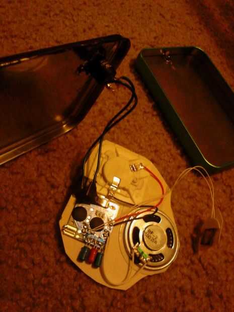 11. Insertar botón (cables primero) a través del orificio en la lata
