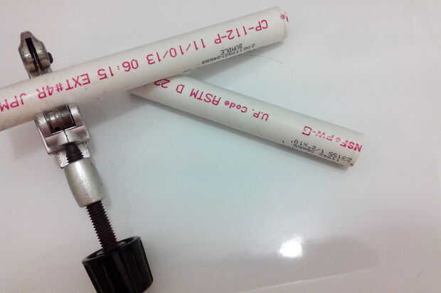 Corte PVC maneja aproximadamente 15cm (6 pulg.) de largo, usando un cortador de tubos o sierra para metales.