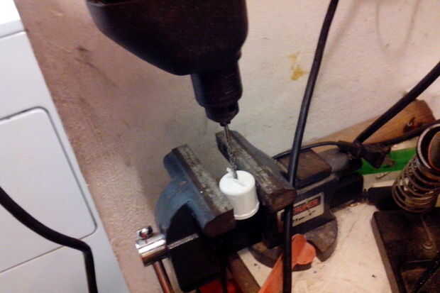 Taladrar un agujero en el centro de cada tapa de sólo lo suficientemente grande como para que el cable para pasar y tener algún juego para gire.