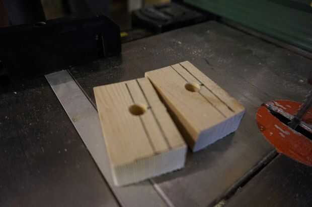 Ahora debe tener dos pequeños pedazos de madera, cada 2 1/2" de largo, con los orificios que ha perforado en el paso anterior centrado a lo largo de los bloques (ver foto).