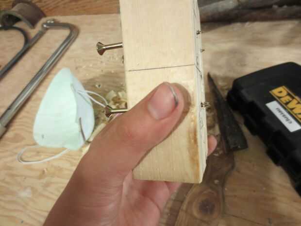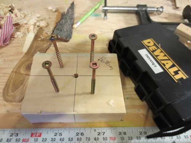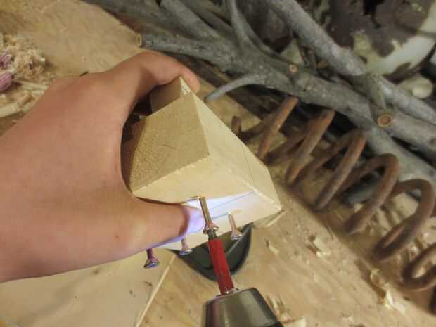 1. Enrosque cuatro tornillos de la parte inferior de la pieza grande de madera, mantener apretándolos hasta que casi se pegan en su banco de trabajo (que quieras los puntos apenas sobresale).