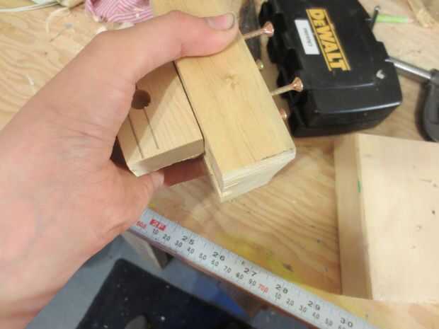 2. A continuación, mantenga una de las piezas pequeñas de madera contra su pedazo grande, los agujeros deberán estar alineados fácilmente si tienes los puntos de los tornillos sobresaliendo.