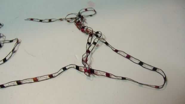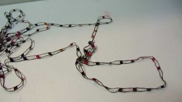 No tengo una cadena delgada pero tenía algunos cinta escala que usar para hacer collares, hice una cadeneta de crochet/macramé muy básico donde hacer un bucle en la cuerda, pasar la cadena a través del bucle para formar otro lazo y tire del lazo 1 Apriete y repetir según sea necesario. Dejé la cinta desatadas y atados los 2 extremos.
