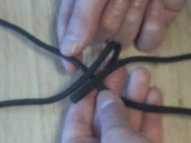Paso 1: Paso 1Lo que se necesitaDos longitudes de 9' de paracord.Un llavero/mosquetón.TiempoPaso 2: Paso 2 Centro el paracord y arreglar el mosquetón como estaPaso 3: Paso 3 Llevar la hebra posterior del lado derecho hacia el frentePaso 4: Paso 4 Rep