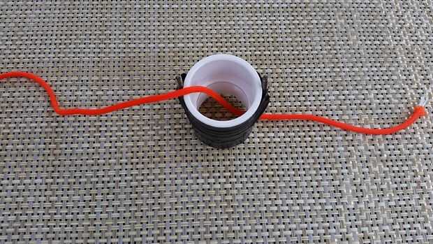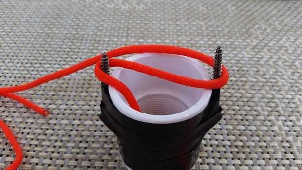 a partir de la trama es bastante simple. Comience por colocar el extremo de la paracord a través de la Copa con cerca de tres pulgadas de cable a través de la parte inferior de la taza. Ahora toma el resto de la paracord y envolver en forma de ocho alrededor de los clavos o tornillos como se muestra en la foto de arriba.