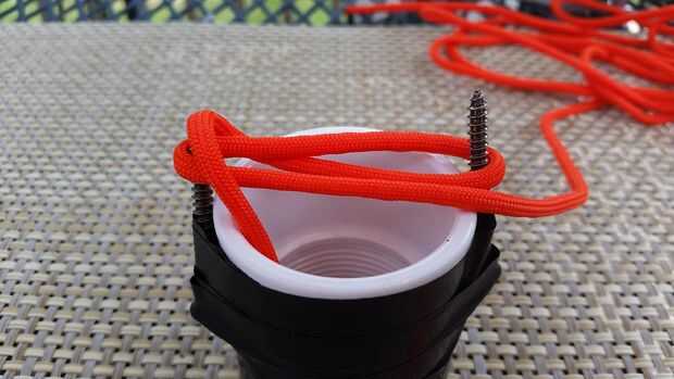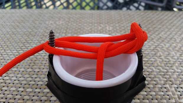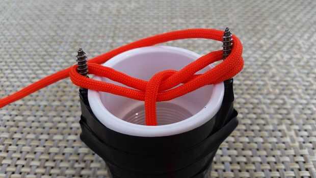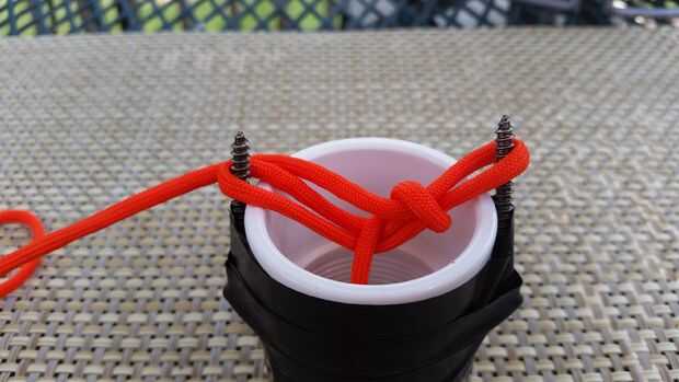 Ahora es el momento para hacer la cuerda de seguridad real. Para ello tome el paracord exceso y envuelve una vez alrededor de los tornillos. Asegúrese de que esta envoltura está por encima de la envoltura de ocho en los tornillos. Ahora tome el primer bucle de la figura ocho y tire con el cable que acaba envuelto alrededor de los tornillos, ahora toma el segundo bucle de la figura ocho y colocárselo sobre el cordón que envuelto alrededor de los tornillos. El paracord y otro en los tornillos y repita el paso anterior hasta que sólo tienes 6 pulgadas izquierda de la médula.